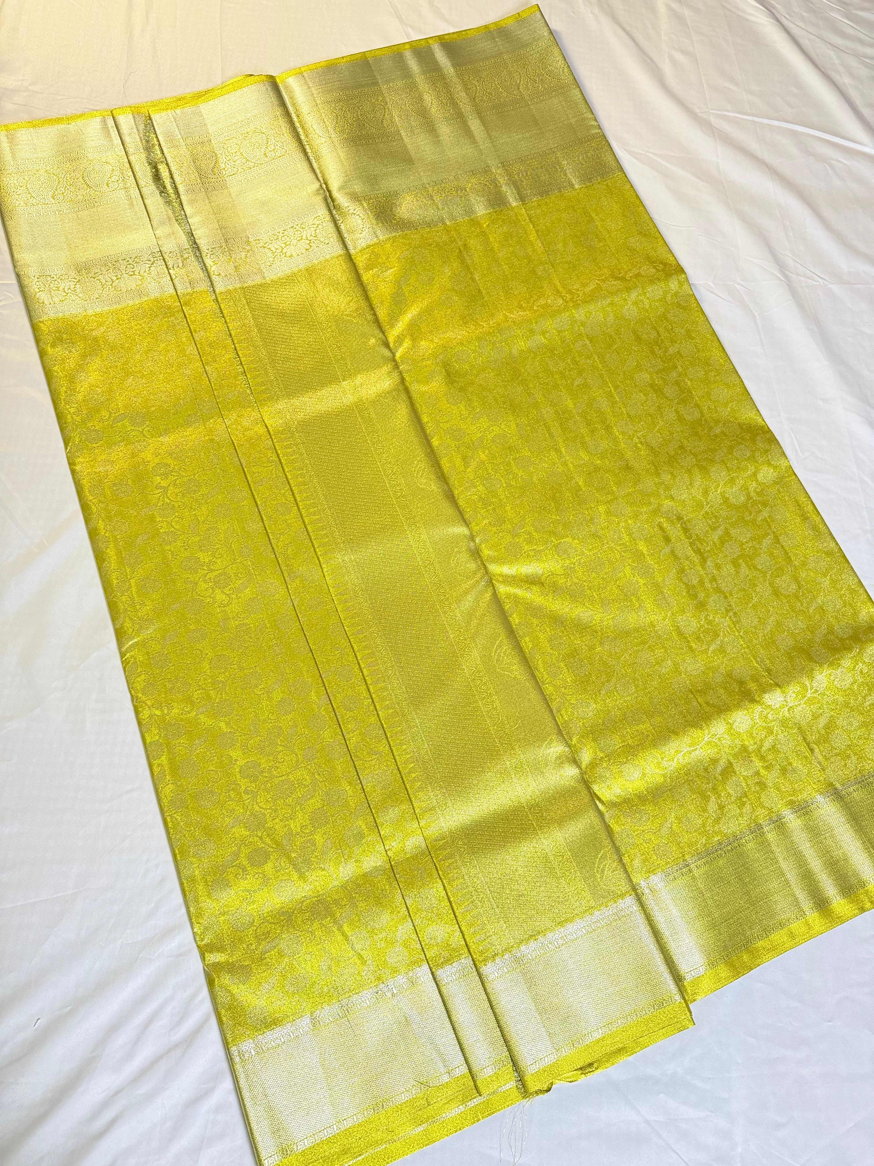 A radiant pure silk saree in a bright golden-lime hue, woven with delicate silver zari for a luminous finish. Its classic Kanchipuram craftsmanship brings out floral and paisley textures in every fold.