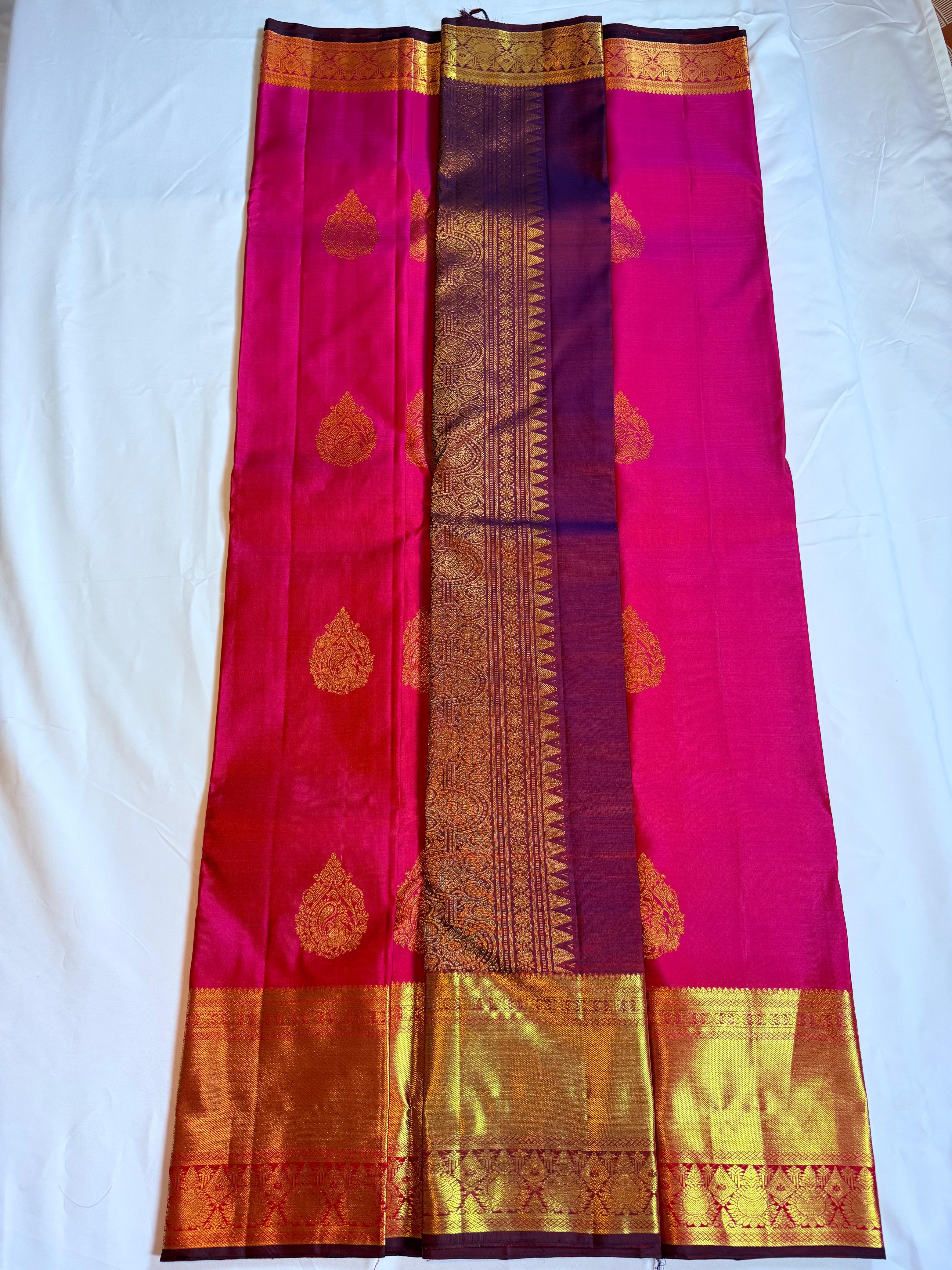 Color: Deep pink body with maroon pallu and golden zari detailing